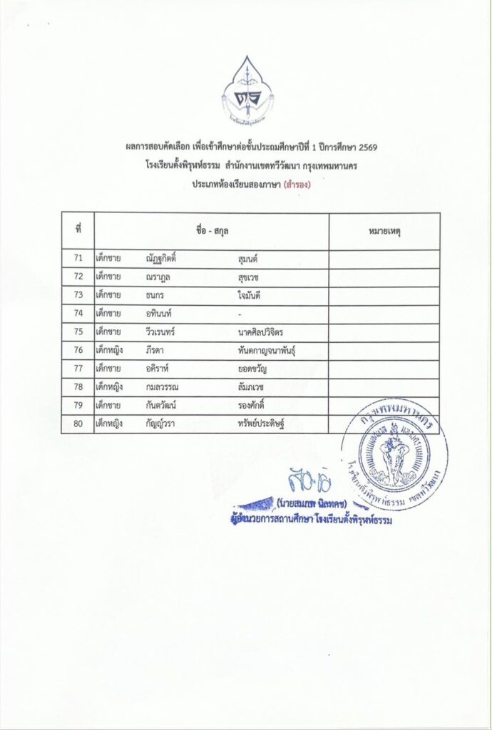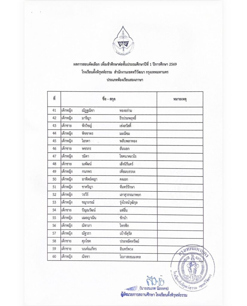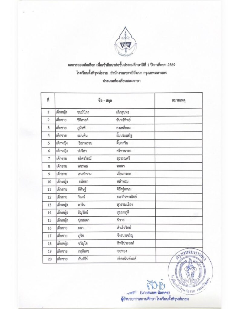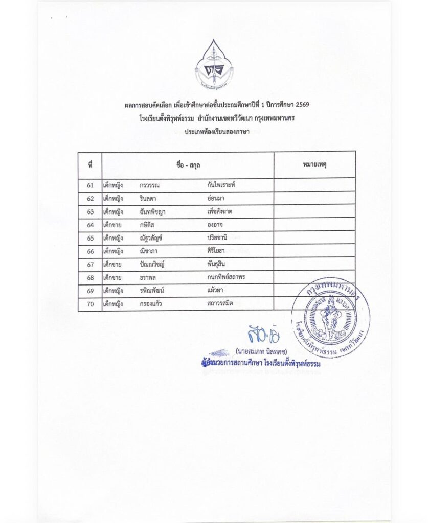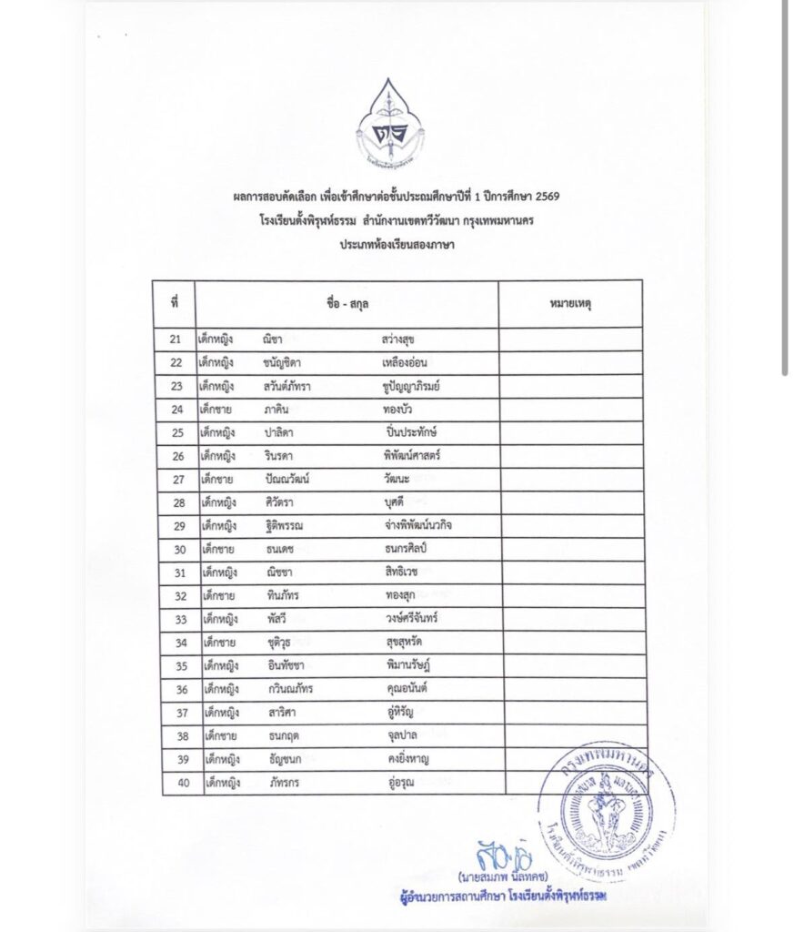 รายชื่อนักเรียนผู้มีสิทธิ์เข้าศึกษาต่อระดับชั้นประถมศึกษาปีที่ 1 ห้องเรียนสองภาษา (Bilingual Program)by adminon Posted on 14/03/202614/03/2026 ประกาศรายชื่อนักเรียนผู้มีสิทธิ์เข้าศึกษาต่อระดับชั้นประถมศึกษาปีที่ 1 ห้องเรียนสองภาษา (Bilingual) FacebookShare on XLinkedInWhatsAppEmailCopy Link